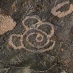 In the Hopi Sun Park we had been told that the spiral was the way Native Americans marked time or cycles. In this petroglyph we think we can see validation for this. The spiral marks one complete cycle. On the outside of this time marker there are several circles, possibly representing the sun or the moon, in various degrees of eclipsing the time symbol. It seems to us that these are Native American in origin. So how does all this relate to the initial claim of foreign visitors? |