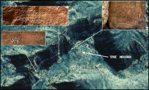 There are many references to a hill or mound in these translations. Dr. Harris, who has not been to the site, could not have known that the canyon contains a ramp-like mound of earth that rises up some fifty feet to the canyon wall. At the top of this "ramp" there is an unusually large amount of symbols and layer upon layer of ligatures. The surface of the rock face at the summit of this mound has literally been worn flat by repeated inscriptions in the stone. This mound can easily be seen in a satellite photograph (taken in infrared) of the canyon [below].