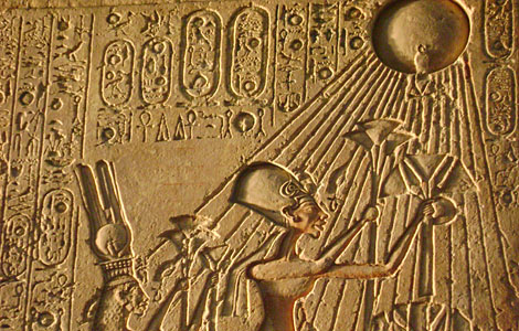 Right: Akhenaten shown worshiping Aten, represented by the sun disc and rays.