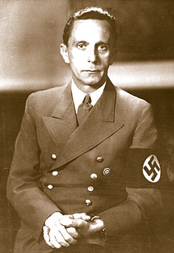 The real music conspiracy story begins in 1910 when a man named John Calhoun Deagan [right], an alleged member of the US Naval Intelligence which was funded by the Rothschilds through their agents in the Rockefeller family, joined the American Federation of Musicians and convinced the group to endorse a standard of 440 Hz tuning for all orchestras and concert performing musicians. He was successful but this standard only applied to public performances in America. Moving forward a decade, JD Rockefeller and JP Morgan created the Federal Reserve Bank as Illuminati agents and established the Rockefeller Foundation (1913). They began implementing their plans for what is now commonly known as the "New World Order". Their first endeavor was the promotion (and funding) of the idea that society would be greatly improved with the elimination of the "inferior people" (i.e. those with feeble minds, alcoholics, criminals, those with genetic diseases) through imposed sterilization and euthanasia. Eugenics (the selective breeding of humans) was a popular idea among the elite and much has been written about this in the darker chapters of American history. For example, Kellogg's corn flakes (for which they are now famous) was initially developed as an inexpensive "feed" for inferior humans who were to be held in what amounted to concentration-style labor camps where they would be sterilized and allowed to die off while earning their keep. But I digress. The Rockefeller's had only limited success with the introduction of so-called "racial hygiene laws" (one law actually passed in the state of Virginia). The American public was apprehensive about this idea as many impoverished people and certain racial types were included in the "inferior" category and slated for elimination. What they needed was a vehicle to convey their grand ideas to the common man. At about this same time, Thomas Edison had invented the phonograph and cinemas were beginning to show films made with soundtracks, both live and recorded. The potential to utilize sound as a propaganda tool was quickly realized and General Electric (Edison's new company) received large grants from the Rockefellers to develop this. They also funded acoustic research through the U.S. Naval and National Defense Research Council geared at finding ways to alter the emotions through music. They were especially interested in the ability to create mass hysteria and interviewed families who had been driven to a frenzy by Orson Wells' broadcast of War of The Worlds. They realized the potential that audio and music could have on the human psyche and incorporated these ideas in their plan for global mind control. [source] Because the phonograph records and "talking" movies were produced in America, these new technologies were forced to comply with the American Federation of Music's 440 Hz tuning standard. Soon a slew of propaganda films were shown in Edison's theaters before and after the main features and surveys were conducted to determine the emotional effectiveness of the musical soundtracks. At the beginning of the 1930s, the potential of 440 Hz to combat altruism and stimulate nationalism, narcissism and aggression was fueled by the new science of Psychology. Freud's psychoanalysis in Europe was mainly for the elite but his theories of mass hysteria found their way to America through his nephew, Edward Bernays, who successfully used Freud's theories and mind control techniques in advertising and politics. He was the first to note that only about 8-10% of a population needed to be convinced of a new idea for it to eventually become unanimously accepted. This has been called the "10% Solution". The Nazi Connection The Rockefeller Foundation was anxious to apply these new mind control techniques on a global scale. Together with the Rothschild's and global bankers they approached the German minister of Propaganda, Joseph Goebbels, who was already utilizing many of Bernays' advertising ideas to promote the Nazi Party.