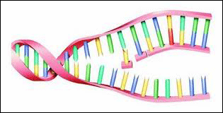 [Right: DNA is a complex molecule that resembles a spiral ladder. When it divides, it splits along the "rungs" then each half of this "ladder" rebuilds the missing half -- viola! -- two DNA molecules. Now the cell can divide. The old cell dies and the new cell continues on.]