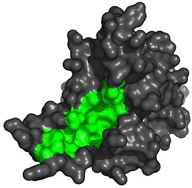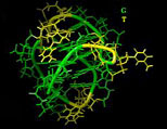 [Right: A 3-d rendering of the telomerase enzyme.] The molecular structure shows an interesting "groove" (show in green) where the enzyme attaches to the end of the DNA molecule.