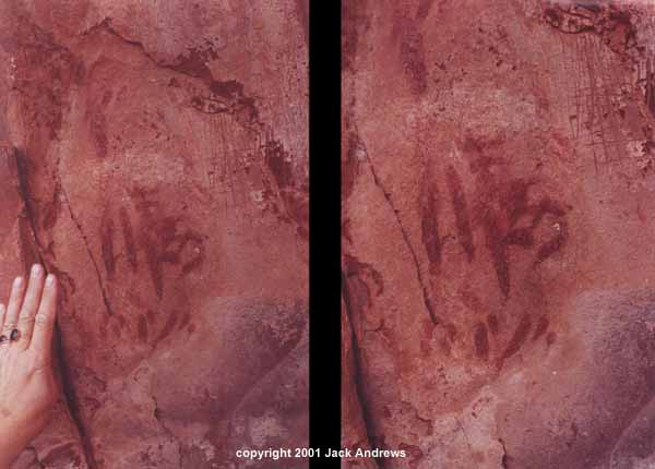 We then started up the rocky trail leading to the picture writings, which are under a protective overhanging cliff, mostly on vertical walls in a series of shallow alcoves or grottoes. I expected to see some very interesting and mystical pictographs, but I never expected to see a particularly amazing written symbol that was actually waiting, painted on the rock, sitting unrecognized over the centuries, hidden in front of the eyes of countless visitors. As we approached the first grotto, this ancient image was directly in front of my eyes and stood out among the other paintings like a flashing sign. As a lifelong artist I have spent many years using artists tools and paintbrushes and I immediately recognized the red markings applied to the rock here as brush strokes. They taper off at the end of each stroke as clearly as brush strokes in calligraphy.