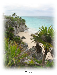 [Left: Beach scene in Tulum, Cancun area. Right: Map showing their voyage from Chetumal to Cancun.]