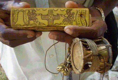 [Above Left: Mr. Subash Bose displays an ancient Tamil Pachesi board kept as a relic in the temple of his area. The Tamils and all the tribes of Meso-America, from Mexico to Panama, played the same board game: Pachesi. Right