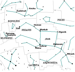 1- M31 Andromeda's galaxy; 2- Mirach (Beta Andromeda); 3- Alpheratz (Alpha Andromeda); 4- Omicron Andromeda; 5- HR8632 in the Lacerta constellation (Yale catalogue of stars); 6- Scheat (Beta Pegasus); 7- Psi Pegasus; 8- Pi Pegasus; 9- Algenib (Gamma Pegasus); 10- Theta, Iota, Lambda, Kappa, Gamma and Omega Pisces; 11- Beta Pisces; 12- Eta Aquarius; 13- Markab (Alpha Pegasus); 14- Homam (Zeta Pegasus); 15- Theta Pegasus; 16- Ancha (Theta Aquarius); 17- Sadalsud (Beta Aquarius); 18- Alpha Equuleus; 19- Enif (Epsilon Pegasus); 20- HR8313 in the Pegasus constellation (Yale catalogue of stars); 21- HR8173 in the Pegasus constellation (Yale catalogue of stars); 22- Delphinus constellation; ?- Figure not yet defined in astronomical context.