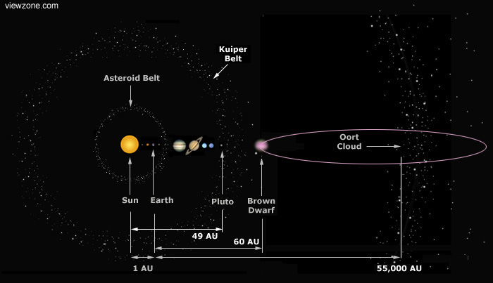 ![]() The newly discovered brown dwarf is reported to be located just about 60 to 66 AU (1 AU=the distance from the Sun to Earth) from us (its parigee), currently in the direction of the constellation Sagittarius. Because of periodic gravitational disturbances in areas of space further out, specifically in the Oort Cloud, the Spanish group of astronomers believe G1.9 travels in an elliptical orbit extending possibly hundreds of AU beyond the furthest known planets (its apogee). Its position just beyond Pluto suggests it is at its closest approach to the Sun and Earth. Space appears relatively free of debris [see image above] inside the planetary orbits. This is because the gravitational pull of each planet (a large mass) effectively collects the interplanetary debris (small mass). But there are exceptions.