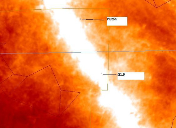 ![]() The object, G1.9 [above right] is currently located in the direction of our Galaxy's center, Sagittarius, which glows bright in this infrared spectrum image. Because of the bright background G1.9 is not visible in normal light wavelengths.