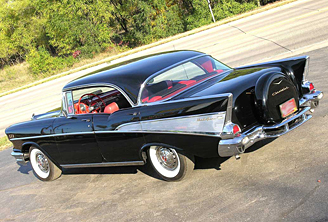 The 1957 Chevrolet [below] is a car which was introduced by the Chevrolet division of General Motors in September, 1956. It was available in three series models: the upscale Bel Air, the mid-range "two-ten", and the "one-fifty". A two-door station wagon, the Nomad was produced as a Bel Air model. An upscale trim option called the "Delray" was available for two-ten 2-door sedans. It is a popular and sought after classic car. These vehicles are often restored to their original condition and sometimes modified. The car's image has been frequently used in toys, graphics, music, movies and television. The '57 Chevy, as it is often known, is an auto icon. From a numbers standpoint, the '57 Chevrolet wasn't as popular as General Motors had hoped. Despite its popularity, rival Ford outsold Chevrolet for the 1957 model year for the first time since 1935. The main cause of the sales shift to Ford was the fact the '57 Chevrolet had tubeless tires, the first car to have them. This scared away sales to Ford as many people did not initially trust the new tubeless design. Also Ford's introduction of an all-new body styling that was longer, lower, and wider than the previous year's offerings helped Ford sales. However, the 1957 Ford -- with the exception of the rare retractable hardtop model -- is not nearly as prized by collectors today as the 1957 Chevrolet. Throughout the 1960s and 1970s, the '57 Chevrolet was a popular used car and highly prized "street machine" or hot rod in 1957 terms. It was the final year of the "shoebox" Chevrolet, as 1958 saw the introduction of a much larger and heavier "X" framed Chevrolet. The ideal size of the '57, combined with its relatively light weight compared to newer full-sized cars, made it a favorite among drag racers. The engine bay was big enough to fit GM's big-block engines, first introduced in 1958 and popularized in the 1960s by the Beach Boys in the song "409".