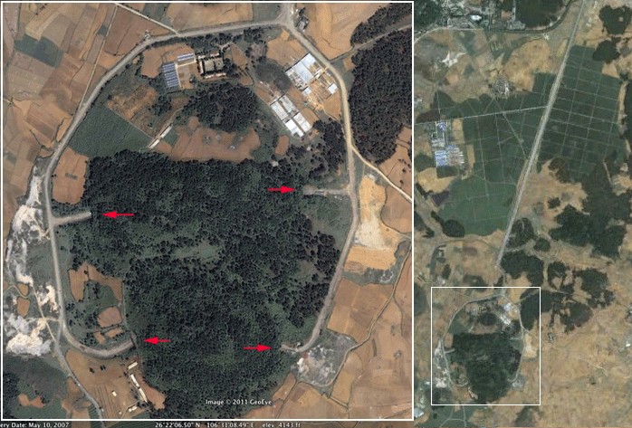 Blending Into the Countryside Compared to the somewhat sterile landscapes surrounding the security perimeters of most USAF bases, the Chinese have a pension for landscape and gardening that minimizes the environmental impact of their underground bases. If not pointed out to observers, the imagery of these bases could easily be overlooked and mistaken for farmland.