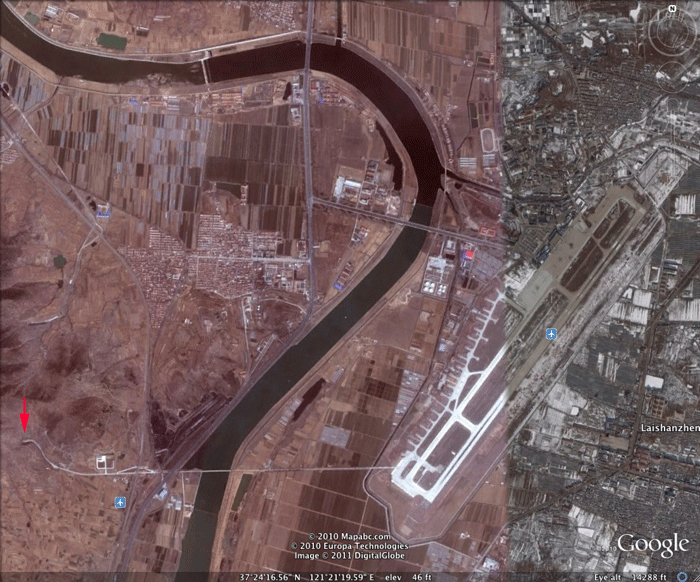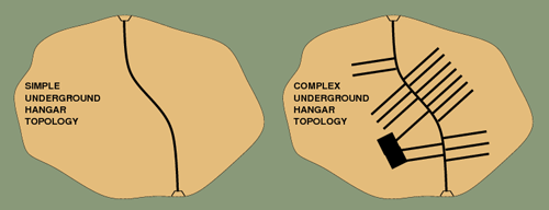 ![]() Abandoned Soviet-era air base bordering Mongolia Taxiways from both ends of the runway complex fanned out to individual earth berms where the aircraft were stored, serviced and armed. The image above is that of an abandoned Soviet-era air base near the border of Mongolia. It's typical to see the old bases appear ransacked so as to validate (to those observing satellite images) that the bases have been decommissioned. The biggest dangers to aircraft on the ground are from strafing by other aircraft and the tremendous overpressure from a nuclear explosion. Surprisingly, the heat blast is mitigated by the high infrared reflection of the aluminum skin. While the paint would vaporize, the heat would not significantly damage the aircraft. Enclosing the aircraft in a deep earth berm at one time impeded the ability of an attacking aircraft to fire on it. The attack required a steep dive to be effective. Today, aircraft like the A-10 Warthog are specifically designed for this angle of attack. So-called "smart bombs" can also achieve this angle. Overpressure and electromagnetic pulse (EMP) from nuclear bombs made all above ground aircraft vulnerable and berm protected bases obsolete. By 1963, the plans for moving underground were already being implemented. Where the topography and geology allowed it, runways were built next to mountains or hills made from granite. Existing bases were altered to provide access to underground hangars, some even before the underground construction had begun. Although the underground hangar would ideally be close to the runway, sometimes it was as much as two kilometers away, like this example at Yantai which even crosses a river.