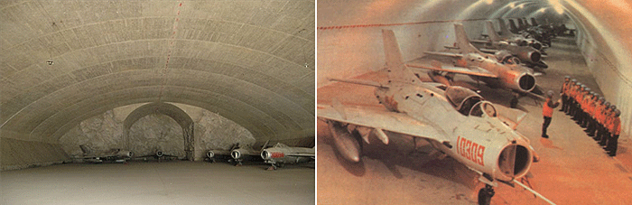 ![]() The basic idea is for the aircraft to be housed in a tunnel, with an entrance and an exit. Like a hornets leaving their nest, the fighters emerge one-by-one from the underground exit and take off from the runway. Upon returning, they taxi to the entrance where, safely inside, they are serviced, re-armed, fueled and sent off on another sortie. No known photos are available of the insides of functioning underground air bases today; however, an air force museum at Datangshan has been constructed inside a decommissioned underground air base and it reveals a much more complex design [above right and below] with large rooms for making repairs or for storing arms.