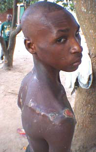 When night comes, Drissa [right] is again locked into a small room with 17 other teenage boys, with one tin can to share as the toilet. He, like his "roommates," have been tricked into a life of slavery. Stopped on the city streets of Korhogo, in West Africa's Ivory Coast, Drissa was offered what he thought was a good job working on a cocoa plantation. When he reached the isolated farm, however, he soon realized he was taken there as a slave. He tried to escape but was savagely beaten.