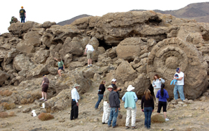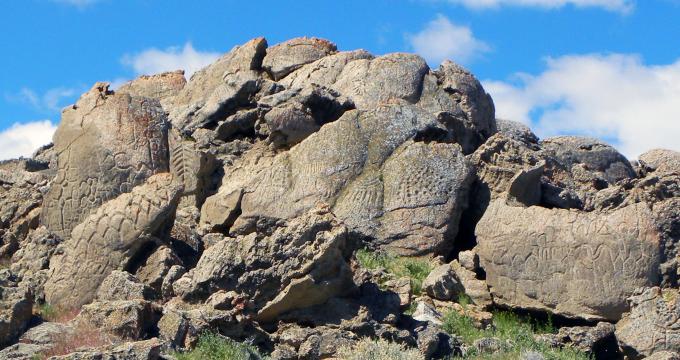 "In order to determine the age of this set of petroglyphs in Nevada, researchers studied the calcium carbonate deposit layer on the rock's surface -- an indicator that the rocks had once been submerged in water. Between 13,000 and 15,000 years ago, the lake levels dropped below the level of the boulders." Scientists concluded that the incisions were made before the water levels rose during the Ice Age, and the Lake Lahontan formation. The now-dry Winnemucca Lake was a remnant of Lake Lahontan.