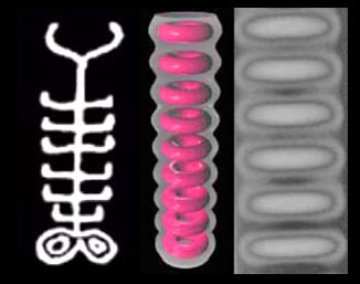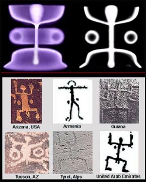 ![]() Dr. Peratt and his team have discovered that this shape, especially when depicted with two "dots" or circles on each side of the mid-torso, is recreation of what was seen in the sky of a huge plasma discharge. The plasma event of 10,400 BCE was huge and went through many different variations as the energy dissipated. The "stickman" is but one of these phases. At other times, pairs of plasma filaments encircled the planet from the North to South Poles. The plasma column extended into space for thousnds of miles at the South Pole but was visible to inhabitants in the Northern hemisphere. 56 filaments appear repeatedly