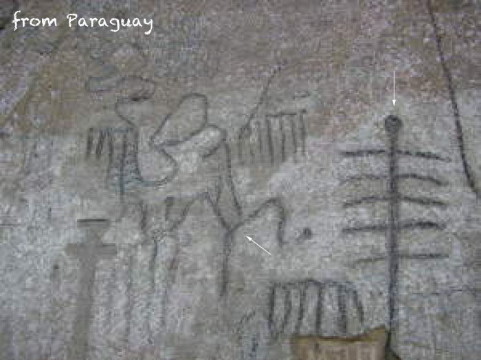 The Plasma Tree: A world wide phenomenon ![]() Petroglyphs from all over the world, made during the "event" (about 10,800 BC) depict a shape that reminds archaeologists of a tree. Click Here to see larger picture of the Paraguay petroglyphs. Note the white arrows depicting the familiar shapes.