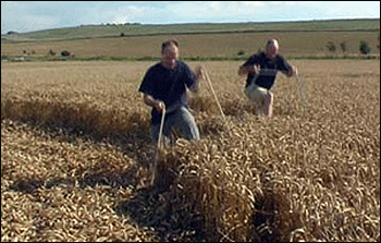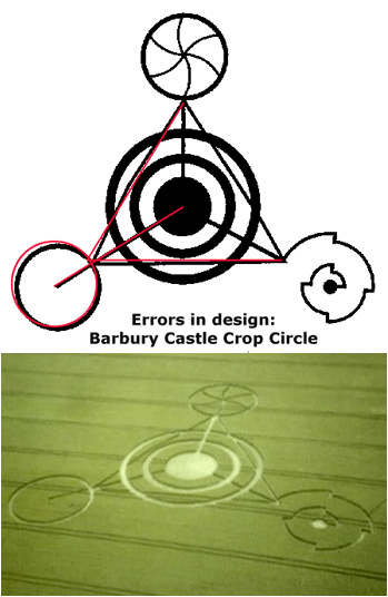 The creation of crop circles is not, however, without mistakes. The famous Barbury crop circle [Above right] is a good example. When a precise survey of the formation was taken it was noticed that one of the elements was slightly misaligned. One circle maker, claiming to be responsible for this formation, acknowledged that he had made an error and felt sure that the circle would be deemed a "fake". To his surprise, believers did notice the error but described it as a deliberate message by the non-human designers.