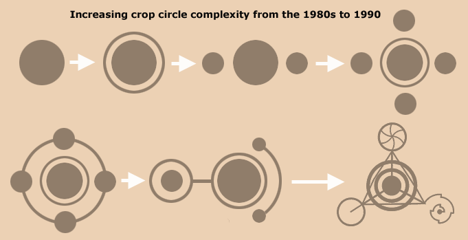 Around 1990, after the media started to take an interest in crop circles, more complex arrangements appeared with circles connected by straight lines, called "bridges." Some were quite large, recorded at over 360 feet in length. The interior of the circles sometimes showed a pattern and the direction of the felled plants changed to contribute to the design. Occasionally odd shaped were extending from the edge of the circles leading some people to theorize that the circles were "saying something" in a graphic language yet to be understood.