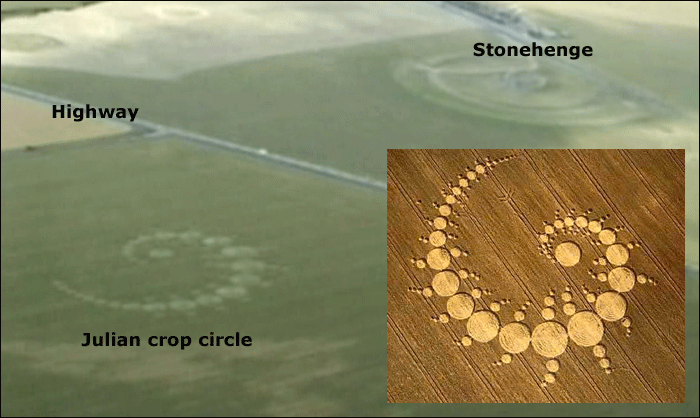 On July 7, 1996 a pilot and photographer were flying circles around the famous Stonehenge site in mid-afternoon. They made several passes around the area before the pilot landed at a nearby airport to refuel. After about 40 minutes, the pilot took off again, leaving the photographer at the airfield. When has passed over a field adjacent to Stonehenge he was shocked to see a huge formation of circles that was not there before. The circles appeared to make a fractal formation called a "julian set" and thus the formation got its name.