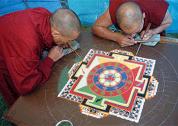 If belief in Crop Circles is a new religion, then the formations themselves serves as its temple or church. Made of living material, crop circles serve as monuments dedicated to nature. Yes, they are temporary. Like the Tibetan mandalas [right] which are created in sand and swept away, crop circles are routinely harvested by farmers. They remind us that we too are temporary and that material attachments only bring sadness.