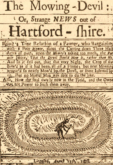 This is a depiction of a crop circle from 1678 [right], shortly after the Pilgrims came to Plymouth Rock. It was found in a woodcut with the title 'Strange News out of Hartford-shire'. It depicts a devil-like creature cutting out a circular pattern in an oat field with a scythe.