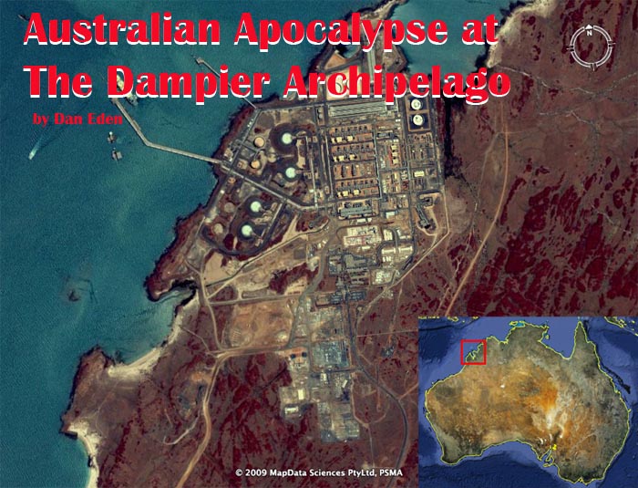 by Dan Eden for Viewzone When I first visited Australia I was impressed. The people in Sydney were extremely friendly and proud of their country. In a pub, after I learned that Fosters Lager was considered swill (like America's Budweiser) and drank many mugs of the "good stuff," I was told that I'd miss Australia when I finally left. "Stay here as long as you can, mate. We're a peaceful country. We don't have a history of wars or being militant. You will love it here." Boy, was that ever right on the spot! But as you get away from the "average bloke," you begin to see that the government of Australia starts to resemble that of America. There is indeed a militant faction that seeks to force its wishes upon the peace-loving people, even when it opposed everything good that embodies the "land down under" and sets it apart from other aggressive countries. This paradox is exposed in a situation known as the "Australian Apocalypse." It involves a beautiful collection of 42 islands and islets on the West coast of Australia -- called the Dampier Archipelago -- that contains the world's largest collection of rock art comprising at least 600,000 extremely ancient petroglyphs and millions of stone arrangements dating back to the last ice age. Were this ancient museum of human history located in other countries it might be designated a World Heritage Site or made in to a National Park. But the Australian government has chosen to use this site for other purposes. Starting in 1963 and continuing through 2004, the government of Western Australia allowed the islands to be used for huge petrochemical plants and storage facilities, destroying about a quarter of the petroglyphs outright and eroding those that remain from chemical residues. Although the actual Dampier site measures just a few square kilometers, they have already crammed explosive material there equal to 1,500,000 tons of TNT or the same potential as 100 Hiroshima-size bombs! New plans, opposed by a majority of Australians, would add an additional equivalent of 1,800,000 tons of TNT, or the equivalent of 120 Hiroshima-size bombs!
