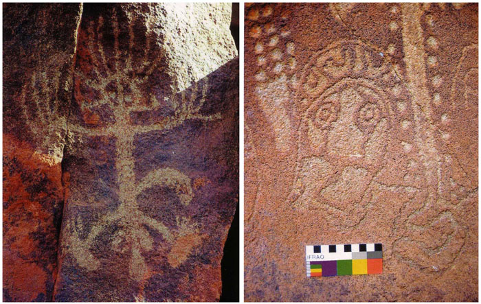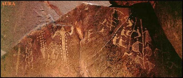 In 1960 a causeway and rail system was constructed to connect the islands with the shore, but the area has remained largely unstudied and underappreciated. This is largely because the region of Western Australia is itself remote and underpopulated. Archaeologists who do make the effort to visit the petroglyph sites are extremely surprised by the variety, quantity and age of these ancient images. One way to look at the site is to consider it as a very ancient museum. At a time before humans developed a language or system or writing, pictures were used to record events and express ideas. The area is literally a history book, written upon rock, that tells the story of humanity going back to the pleistocene era. Some sites are from 40,000 to 60,000 years old! ![]() Petroglyphs are made using any of three techniques. The most common in known as "pecking" where a sharp stone has been used to chip away the surface of the granophyne stone (an extremely fine grain ans hard rock compound). The surface is usually a darker color because of atmospheric oxidation, called patination, and the underlying rock is a lighter color, making the petroglypjs highly visible. Another technique is to use a sharp stone to scrape the surface of the stone, revealing the lighter underlying rock. The third method is called "bruising" where a stone is pounded againt the surface, compressing it and causing particles to fall away, revealing a lighter color. ![]() Most of the images are of animals, fish, birds, mammals -- including some that are long extinct -- and spirits.They represent legends, achievements, fantasies and perhaps even music of the earliest human beings. Some of the petroglyphs have repeating images with each image being slightly different. This used to puzzle archaeologists until they realized this was an ancient method of animation. In this way, dances and hunting techniques could be recorded in "steps" that were understood by the viewer. The ealiest recorded inhabitants of the Dampier Archipelago were the Yaburara people. Unfortunately they were killed in a shameful massacre over an eight day period in 1868, a dark episode in Aboriginal history called the "Flying Foam Massacre."