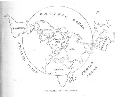 I once tried vainly to reconcile the flow of those rivers between India and the North Pole. Later on, I found out that the ancients were not knowledgeable enough of the laws of gravity and whether the earth was flat or round. They reasoned that since the North Pole was at the top of this globe, it was only natural to assume that the waters and rivers of the world flowed downward, either dripping off the world at the South Pole or flowing into the ocean itself, with the upper part of the world flowing on top of it. See the following illustrations: