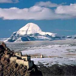 Caption B. Mt. Kailasa, India's Post-Noachide Navel of the World in Western Tibet, is the home of God Shiva and Kubera, India's God of Riches, who was originally from Bulgaria. For the O'odhams, Quivari (Kubera) is the mountain and God I'itoi or Sewa (Shiva) lives within it. Babo derives from the Sanskrit Babu, meaning Grandfather. Kailasa was said to be guarded by poisonous serpents. Archeologists tell me that Baboquivari has more than its share of rattlesnakes.