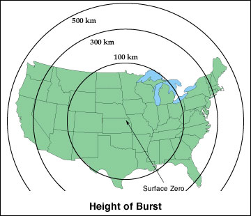 ![]() Areas of medium yield EMP destruction with a single burst over Kansas at 100, 300 and 500 km. The scientists describe three possible EMP effects, depending on the height of the detonation. Because the gamma rays travel in a line of sight path, the most dramatic effect comes from a high altitude blast. Here, the gamma rays can travel further and the Earth's magnetic field deflects the pulse back to the surface. Such an attack could easily be launched from a submarine, just off the coast, and need not be accurate. The altitude and coordinates of detonation can vary widely and the effects will be just as lethal to the electronics. If several are launched, the chances of one reaching its optimum height is almost guaranteed. Once the EMP has been discharged, the circuitry of subsequent missile eletronics will be useless, leaving the victims vulnerable to more attacks. The House Armed Services Committee confirmed that these weapons do not need to be accurately targeted to destroy our infrastructure. A medium size nuke, detonated from between 150 and 500 miles anywhere over Kansas, would be enough to destroy a hundred years of technological development. By comparison, the space shuttle and space station orbit about 110 to 150 miles above Earth, well below the optimal detonation of a potential EMP weapon. An orbiting nuke could possibly already be poised, waiting to be used in a future conflict. If such a weapon is already up there, it is completely beyond our current capability to destroy it. Once it is detonated, our remaining electronic defense systems would be relatively useless. Checkmate.