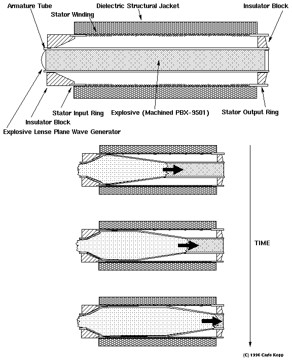 ![]() In the apparatus above, power is supplied by a bank of capacitors. These capacitors are similar to the system used to power a strobe flash. The ignition first charges the large coil, producing a magnetic field. Then an explosive charge begins at one end of the coil, shorting the coil by compressing it against the metallic shield. The effect changes the inductance of the coil, essentially shortening the field as the explosion advances down the tube. The resulting electromagnetic pulse has a wide spectrum of wavelengths, capable of energizing metallic objects of varied lengths, from hundreds of feet to a few inches. All of the artificial "antennae" then become charged with enormous electrical currents which burn and render their components useless. This type of non-nuclear apparatus is almost impossible to detect but is limited in scope and power by the size of the charging capacitors.