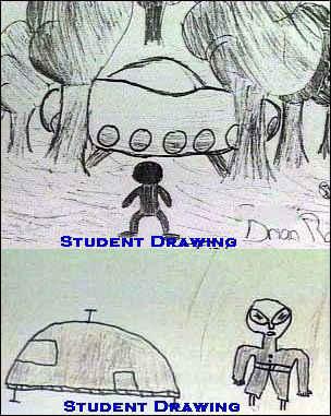 The late Cynthia Hind, known as Africa's foremost UFO investigator, investigated the case the next day. When she was first contacted, she asked the headmaster of the school, Colin Mackie, to have the children draw pictures of what they had seen. When she arrived at the school, he had about 35 drawings for her [right]. The drawings were of very similar -- but not identical -- objects.