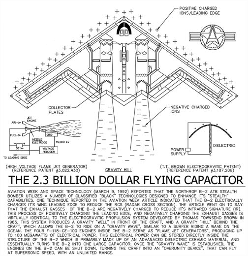 Scratt also discloses that engineers revealed that advanced technology is being utilized on the current B-2 Stealth bomber. One of them referenced, Townsend Brown's Electrogravitic Patent No. 3,187,206, which specifically describes how the B-2 electrically charges the leading edge of the wing to reduce the radar cross section. Then it negatively charges the exhaust gases to reduce the infrared signature. It's essentially a flying capacitor!