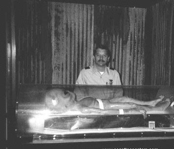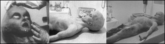 In this video [above], EBE becomes ill during an interview and is assisted by biologists.[Below] Big-nosed Greys in autopsy from "Alien Autopsy" film.