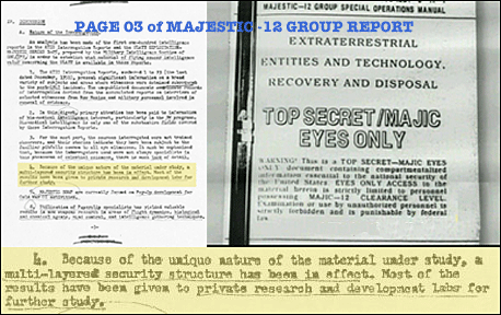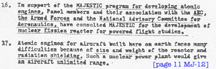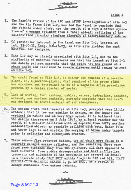 Take a minute to read this page from the MAJESTIC-12 Group Report. This report was prepared on 18th November, 1952, for president-elect Dwight D. Eisenhower, to bring him up to date on the alien "situation" prior to his taking the office. It describes the crash at Roswell (which appears to have been brought down by a military X-plane) and the analysis of the alien technology that was used in the vehicle's propulsion system.