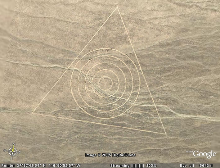 This is just one of the many unusual things that can be seen near Area 51, Groom Lake in Nevada. The tracks are about 16 feet wide. The circle is 2000 feet in diameter and each leg of the triangle is 4000 feet long. The view can be seen at 37 37'41.54"N 116 50'52.57"W.