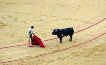 The most famous example of the stimoceiver in action occurred in a Madrid bull ring. Delgado "wired" the bull before stepping into the ring, entirely unprotected. Furious for gore, the bull charged toward the doctor -- then stopped, just before reaching him. The technician-toreador had halted the animal by simply pushing a button on a black box, held in the hand.