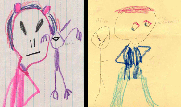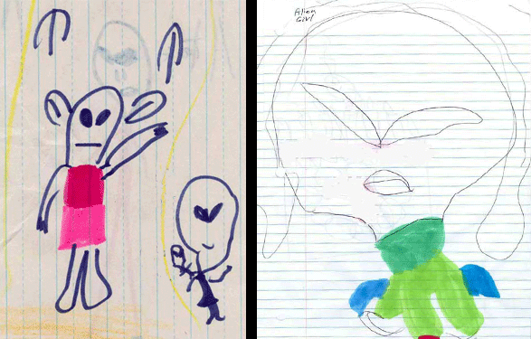 [Above left: Ariel's drawings of aliens "talking" to her with their mind. Above right: What Ariel described as an alien girl.]