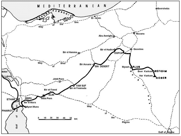 With the help of these data, the Exodus route can be easily retraced day by day, exactly and with certainty. After the Red Sea crossing the Jews had to stop for the whole day at the Ayun Musa wells, just in front of the shoals, in order to water and refresh the livestock and to replenish their own supply. There they celebrated the miraculous passage with dances and singings. Then they moved off northwards into the Etham desert until they reached the track that took them towards Palestine. It took them two days to reach Bir el Mura, the biblical "Mara", some 20 kilometers away. Like with other oasis in the Sinai bearing the same name, Bir el-Mura has wells containing very bitter water, and something approaching a revolt almost broke out as a result (Ex.15,24). From there, the Jews pressed on toward Palestine at a forced rate of march. It took them three days to get from one oasis to the next and at each one they rested for a whole day. These are the stages of the journey referred to in Numbers 33. They left Bir el-Mura on the morning of the fifth day, crossing the Mitla Pass on the sixth and reaching Bir el-Tawal during the afternoon of the seventh. Bir el-Tawal is identifiable with the biblical Elim, an oasis with twelve wells and seventy palms, where they rested for the whole of the eighth day. They left again on the morning of the ninth and reached the following oasis, Bir et-Temada after the usual three days' march, on the eleventh day of the month. The daily average for this first stretch was 13-14 kilometers. Bir et-Temada presented a vast expanse of marshy ground invaded by reeds (still visible today by means of Google Maps), from which the biblically attributed name "Yam Suf", Sea of Reeds (the same as the Red Sea), is derived. Following the usual one day's rest, the Jews set off again on the morning of the thirteenth day, arriving with the full moon at Bir Assane, an oasis which today still maintains its biblical name: the Sin Desert. Exodus 16,1 reports that this was on the fifteenth day of the second month. According to the biblical narrative, the journey required fifteen days between the Sin Desert and Mount Horeb, including three intermediate stops: Dophcah, Alus and Rephidim. The latter was situated no more than 10 kilometres from Mount Horeb, since the distance between the two was covered in less than a single day (Ex.19,1). We, therefore, have a total of ten days' march, during which the Jews could not have covered more than 150 kilometres. On the basis of these limiting factors there could be no alternative: they must have followed the track to Kuseima. After three days' march they reached the oasis of Bir el-Hadira, the biblical Dophcah, where they remained for the entire twentieth day. On the morning of the twenty-first day of the second month, they set off from Bir el-Hadira. Toward the end of the following day they reached a fork: the north-east track goes on to Kuseima and Palestine; on the right, to the south-east, there is a ten-kilometer secondary track to Darb-el-Aza, the high road that descends directly to Eilat on the Gulf of Aqaba. The Jews turned right and that same evening set up camp along the Darb-el-Aza, at Bir Sheida. They proceeded down the Darb-el-Aza during the whole of the twenty-third day of the month, reaching Riyash, the biblical Alus, situated on the bed of a wadi that still keeps its ancient name: Lussan. They departed Riyash on the morning of the twenty-fifth day and at once left the Darb-el-Aza, moving into the Paran Desert in the direction of Har Karkom. They travelled about forty kilometres, and in the afternoon of the twenty-seventh day of the second month they arrived at Beer Karkom--a locality seven kilometres from Har karkom, which Dr. Anati, on the basis of significant archaeological evidence, has identified with the biblical Rephidim. The following day the Jews sustained their "baptism of fire," clashing with a local tribe of Amalekites. The battle lasted until the evening (Ex.17,8-13). The hard-won victory over the Amalekites, who were completely wiped out (Ex.17,13), enabled Israel, on the twenty-eighth day of the second month, to take over a territory which, although a desert area and small, constituted a secure base in which they could become organized for the next conquest without being disturbed. The two days following the battle were spent burying the dead, medicating the wounded, and dividing the spoils of the vanquished. On the first day of the third month, they left Rephidim and in the afternoon they set up camp on a vast plain at the foot of the Holy Mountain. They stayed there for a whole year, during which Moses went from being a simple guide, to become the undisputed head of the "Chosen People" and changed the course of History. In the following map is represented this first part of Exodus' itinerary, which is in perfect agreement with the biblical account. Synthesized below is the entire itinerary, showing the various legs of the journey, the duration of each march and the stops with the respective dates (the dates emphasized are those reported in the Bible or confirmed as certain ):