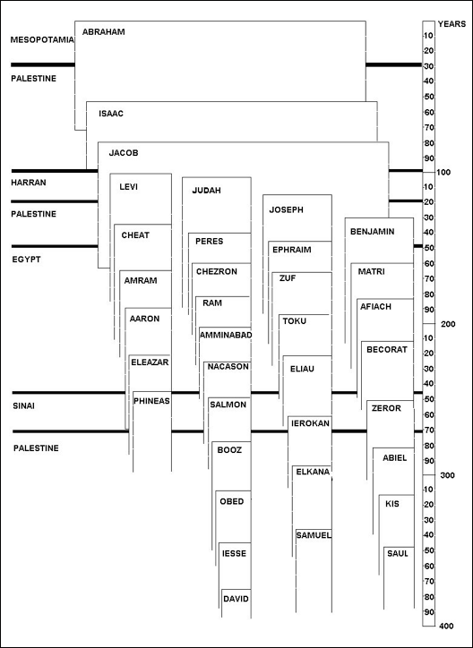 The figures referring to the sojourn in Egypt and to the ages of the Patriarchs, however, are quite contrary to all common sense. The Patriarchs and other characters in the Bible were only men, so it is quite unbelievable that they could have lived for such a length of time. Although the "fact" that the Patriarchs lived for centuries may be irrelevant from a religious point of view, it is quite unacceptable to the historian. In fact, if we then attempt to analyse the narrative from this point of view, the whole thing becomes absurd, even ridiculous, and loses all its value, because the times of the story are enormously stretched out, thus destroying the narrative tissue. But there is no reason why mere numbers should be so emphasized to the detriment of the narrative, which is almost completely linear, showing a oneness and a continuity that cannot be split into separate episodes. It is even more so since a long series of precise non-numerical and, therefore, more reliable information, is given in the Bible itself, that gives lie to the figures mentioned previously. For example, Genesis 15,13 states that the Jews remained in Egypt for four hundred years. Immediately following, however, Genesis 15,16 specifies that the said period refers to four generations, in complete contradiction to the foregoing figure. The four hundred years' sojourn in Egypt is also contradicted by the genealogies of the leading figures of the Exodus, which includes the fourth to the sixth generation after Jacob. If each generation is calculated on an average of twenty-five years, it is clear that the period in Egypt could not have lasted more than a century. It, therefore, becomes evident that the figure "four hundred" and those given for the declared ages of the Patriarchs, cannot be taken literally. There are other figures in the text, such as "three", "seven", "forty" and "seventy" which also seem very unreliable, since they appear too frequently in relation to the normal statistical distribution of numbers. We cannot reasonably accept that these figures always indicate exact quantities. Likewise they cannot be rejected out of hand as being unreliable. It is, therefore, necessary to understand why they are used and if they have a precise meaning or not. A reasonable and quite fascinating theory is that those figures which appear with excessive frequency are used in the same manner and with the same meanings as we use those common terms for indefinite quantities. Therefore, when a figure such as "three", "seven", "forty", "seventy" and "four hundred" appear in the Pentateuch, we have before us an "indefinite quantity", but set within certain limits roughly known to the narrator. If it we accept that the leading figures in the Bible were in no way different from their contemporaries, it seems obvious that the most reliable criterion for studying the Pentateuch chronology is that based on the genealogy of those biblical characters. The most numerous, and also the most accurate, genealogies are those referring to the leading figures of the Exodus, in particular the Levites. Aaron, the elder "brother" of Moses, was the firstborn son of Amram and Jochebed; Amram was the firstborn of Kohath, he being the second son of Levi, son of Jacob. Jochebed, however, was the daughter of that same Levi and had married the "grandson" Amram, following the custom of marriages between blood-relations. Other similar genealogies are given for various people who had leading roles in the Exodus, such as Korah, Dathan and Abiram (Num. 16,1), the daughters of Zelophehad (Num. 27,1) and so on (see following table). From these genealogies it's quite evident that the Jews cannot possibly have lived in Egypt more than 100 years. The genealogical lists, therefore, can be used to reconstruct Pentateuch times, by considering the generations in the same way as the growth-rings of tree-trunks. By connecting together different genealogical lists in which the same persons appear, complete and reliable sequences from Abraham to the kings of Israel (the existence of whom can be accepted without reservation and dated with sufficient reliability), can be obtained. Obviously, this method cannot guarantee absolute precision; but, if the genealogical sequences are not excessively long, any possible errors are sufficiently bounded and in any case do not exceed a few decades. This criterion, therefore, is quite sufficient to set with reasonable certainty the historical period in which the biblical events occur. On this basis then, we can determine relatively simply the period in which certain biblical events took place, solely by making use of the data furnished in the Bible itself. First, let us try to ascertain the Exodus epoch since this is the central episode of the Pentateuch. We can base the calculation upon the genealogy of David since it is sufficiently complete and reliable. It is listed for the first time in the Book of Ruth (4,18-22), great-grandmother of the king, and confirmed in successive Books. From this list we learn that eleven generations separate Jacob's son Judah, and David. An important figure mentioned in the list is Nahshon, son of Amminadab, who played a key role in the events of the Exodus (Num. 2,3). Salmon, son of Nahshon but not specified as his first-born, was perhaps born in the Sinai desert and at the time of the Palestine conquest was no more than a young boy. His son Boaz, as portrayed in the Book of Ruth (Ruth 3,7), was well-off and authoritative, but so calm and staid that he was inclined to doze off at times. When he married Ruth he was probably middle-aged, perhaps over fifty. Ruth gave him a son, Obed, who fathered Jesse (it is not known whether he was an only son or one of many). David was Jesse's eighth male child (1 Sam. 16,10), born, therefore, when his father was well on in years. Solomon entered the world when his father David was no longer young (1 Sam. 12,24). On the basis of these considerations we can calculate
