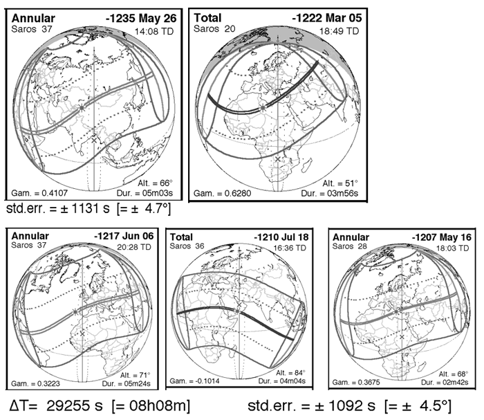 ![]() For each eclipse an orthographic projection map of Earth shows the path of the Moon’s shadows with respect to the continental coastlines. The dotted lines delineate the locus of all points where the local magnitude at maximum eclipse is equal to 0.5. Underneath the maps, the maximum possible error in longitude is indicated, due to the fact that the secular variations of Earth's speed of rotation are not known with absolute precision. At the most for these eclipses it can be of 4.7°, which means that the actual path could had been shifted right or left for no more than 4.7°. To the top right are the dates of the eclipses. A few essential remarks need to be made, in order to understand the correct meaning of those dates: 1) All eclipse dates from 1582 Oct 15 onwards use the modern Gregorian calendar currently found throughout most of the world. For eclipse dates prior to 1582 Oct 04 the older Julian calendar is used. 2) The Julian calendar does not include the year 0, so the year 1 BC is followed by the year 1 a.D. This is awkward for arithmetic calculations. In this publication, dates are counted using the astronomical numbering system which recognizes the year 0. We have to take into account the numerical difference of one year between astronomical dates and b.C. dates. Thus, the year 0 corresponds to 1 BC, and the year -100 corresponds to 101 BC, etc., and the historical dates of the 5 eclipses of the maps are respectively: 1236, 1223, 1218, 1211 and 1208 b.C. 3) A further consideration is important in our case, where the relation between the date of the eclipses and the solstices is relevant. Under this respect the Julian and the Gregorian calendars coincide only for the period around the Nicea's Council, on 325 a.D. (pope Gregory XIII's reform was set up to reproduce the astronomical situation at the time of that Council, when the rules for the calculation of the Christian Easter were agreed). When Jules Cesar, on 45 B.C., started the calendar named after him, the summer and winter solstices fell respectively on 24 June and 25 December, three days later than in the Gregorian calendar, due to the fact that the Julian year is a little bit longer than the Gregorian. As we go back in time, the delay gradually increases to reach 12 days at the exodus' epoch. We have therefore the following equivalence between the astronomical dates of our eclipses and the actual dates: