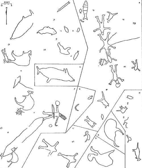Dash's testimony seems to describe a more recent timeline for carving the glyphs. His story is often refuted by stating that the crevice was filled with debris which would have prevented him from seeing the east wall. The interior had been cleaned out before his second visit to the site, revealing the hieroglyphs that were always there. The second group (outside) were always there but only recently got noticed when a group of people were roaming around the site, scouring every rock and stone for petroglyphs. Then there is this old report which I have made available in pdf format (about 400k). It's titled, Records of the Rock Engravings of the Sydney District Nos. 146-162 and is dated November 1966. The survey covers virtually all of the known carvings and petroglyphs in the immediate area of the Kariong Glyphs -- including some remarkable figures [below] which have been interpreted as Aboriginal star charts. But the report makes no mention of either the hieroglyphs in the crevice or the second, smaller group discovered on an outside wall.