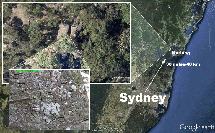 ![]() 33°27'04.14"S / 151°18'09.50"E Many believers of this story claim that the evidence is on two sandstone walls -- in a crevice -- on a privately owned bit of wilderness called Kariong, hence the Kariong Glyphs. This collection of hieroglyphs was first brought to public attention in the late 70s and has since evolved as a kind of Mecca for spiritualists, Aboriginals, new age thinkers and even UFO enthusiasts. The site is located just 30 miles (48 km.) north of Sydney [map above] and is easily accessible by well maintained dirt roads that lead to within yards of the site. There are, so far, no gates or fences or fees. It couldn't be more convenient. Below is a brief YouTube tour of the Kariong site by pilgrim, Guy Carter. He's obviously a believer in the authenticity of the hieroglyphs so be forewarned. The video is pretty good and gives you an idea of what you would see if you went there.