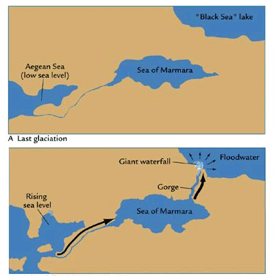 Fig 5: The Black Sea catastrophe, before and after [right]. The water from the Mediterranean (Aegean) Sea, cut through a narrow Gorge (now known as the Bosphorous Strait), and plunged into the Black Sea (whose water level was 80 m below sea level) creating a gigantic waterfall. Every day for two years, 42 cubic km of sea water cut through the narrow channel and plunged into the lake -- more than 200 times the flow over Niagara Falls. Source: NASA