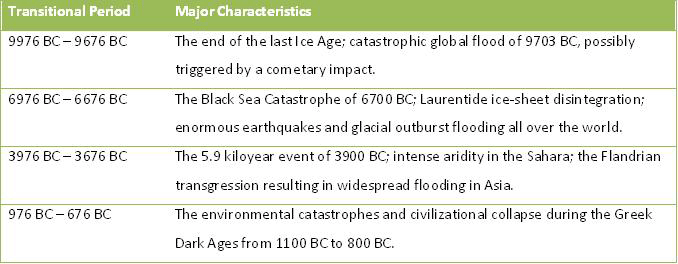 The Yuga Cycle timelines proposed here accurately mirrors the worldwide environmental catastrophes that accompanies the transitional periods between Yugas. The four key transitional periods, since the end of the Golden Age, have been summarized here: