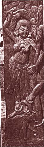 Kubera or Kuha's consort was Yaksini (pictured right on stelle) or a female Yaksha, maintaining sexual intercourse with mortals attached to the service of Durga. In
