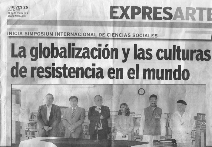 On April 25, 26, 27, and 28, 2007, I was invited to be a keynote speaker in Saltillo, Coahuila, Mexico, at a symposium entitled, Globalization and the Resistance Cultures of the World. It was hosted by such distinguished Mexican personages as Professor Horacio Argani of the Latin American Branch of the Friends of Vedic Culture organization and Mrs. Norma Zapata, director of the Coahuila State Central Library. Saltillo is called the Mexican Athens. The symposium was given wide newspaper, radio, and TV publicity in Saltillo.