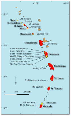 Map of island having volcanoes in the Lesser Antilles.