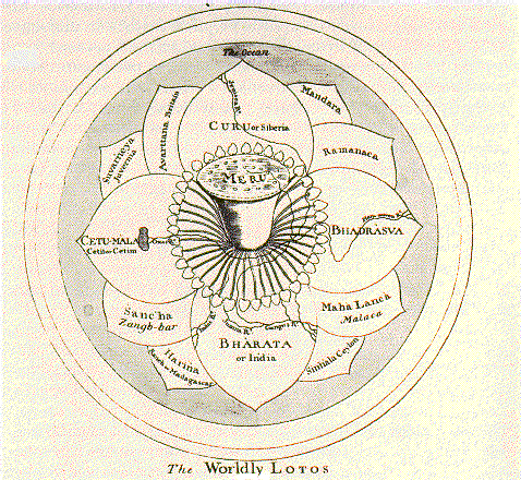 Notice that Ketumala on the left petal is spelled as Cetumala or Chetumala. The one on the right is spelled as Katumala. Kashyapa Sea appears as a black spot on the left map.