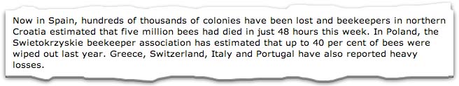 Other reports are equally frightening. Scientists report that bees and other insects usually leave the abandoned hives untouched. Nearby bee populations or parasites would normally raid the honey and pollen stores of colonies that have died for other reasons, such as excessive winter cold. This suggests that there is something toxic in the colony itself which is repelling them.